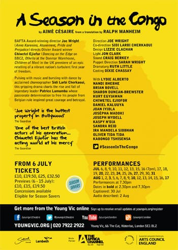 El director británico Joe Wright se ha sumergido en el libro del antillano más de cuatro décadas después de su publicación y trabajado cada detalle de la obra, para mostrar a la audiencia del Teatro Young Vic de Londres (desde el 6 de Julio y hasta el 10 de Agosto) la vigencia y actualidad del relato de la historia del Congo. Para ello, Wright y parte del equipo se trasladaron a Kinshasa para encontrarse con los familiares y conocidos de Patrice Lumumba, protagonista indiscutible de Una temporada en el Congo. Sobre terreno, el equipo descubrió que hay mucho en común entre el antiguo Zaire y el Congo actual, donde el caos y la corrupción siguen beneficiando a empresas y hombres de negocio extranjeros, tanto como a sus socios locales. Fruto del trabajo de investigación previo y de la comprensión de las décadas de conflicto y corrupción que vive el país, la obra se ha sabido actualizar y se ha convertido en un relato imprescindible para comprender la situación económica y política que vive el antiguo Zaire.