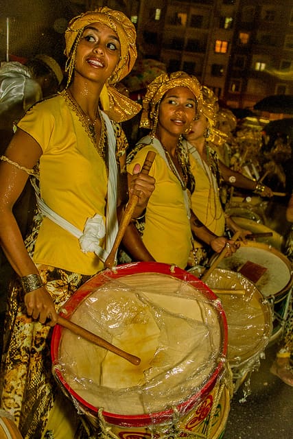 Así, en la noche del viernes que precede el inicio de las fiestas en todo el país, las más de 200 personas que forman parte del grupo, se juntan en el centro de la ciudad y comienzan un desfile de cerca de tres horas hasta la iglesia Nossa Senhora do Rosário dos Homens Pretos, construida gratuitamente por trabajadores negros en el inicio del siglo XX. Una multitud emocionada acompaña el trayecto. Bajo las luces amarillas de las calles angostas y deterioradas, música, baile y teatro se mezclan para contar en colores y movimientos los mitos de la tradición afro-brasileña y homenajear sus protagonistas, los orixás.
