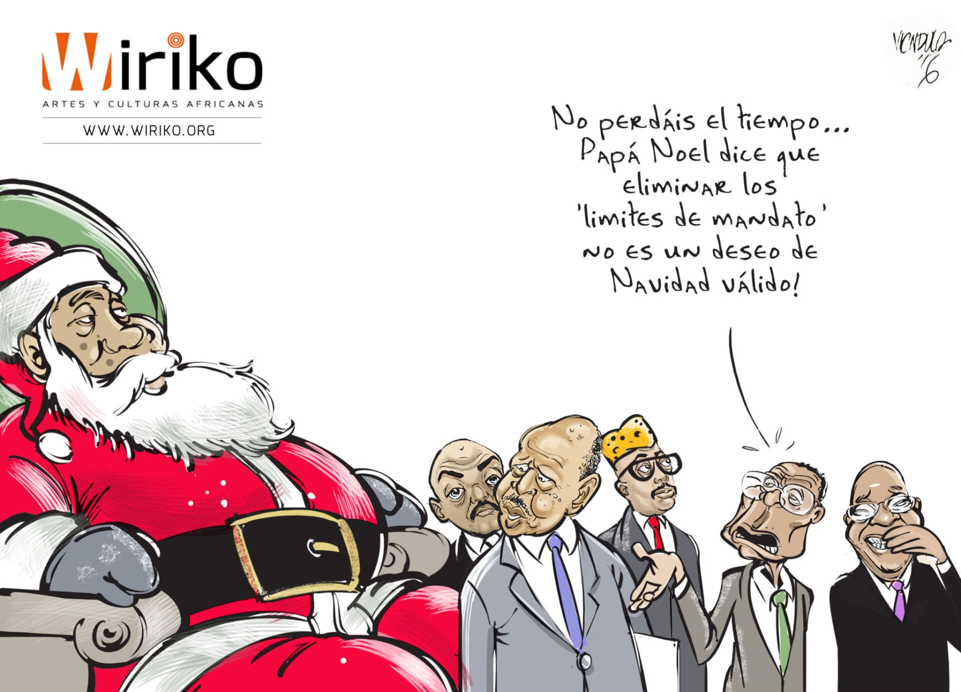 Desde uno de los periódicos más leídos de Kenia, The Star, Victor reparte puñetazos burlescos para todo el mundo diariamente. En la postal Navideña que regala a Wiriko esta Navidad 2016, Papá Noel hace caso omiso a los presidentes africanos que le piden eliminar el límite de mandatos. De izquierda a derecha, Pierre Nkurunziza (Burundi), Yoweri Museveni (Uganda), Joseph Kabila (República Democrática del Congo), Robert Mugabe (Zimbabue) y Jacob Zuma (Sudáfrica).