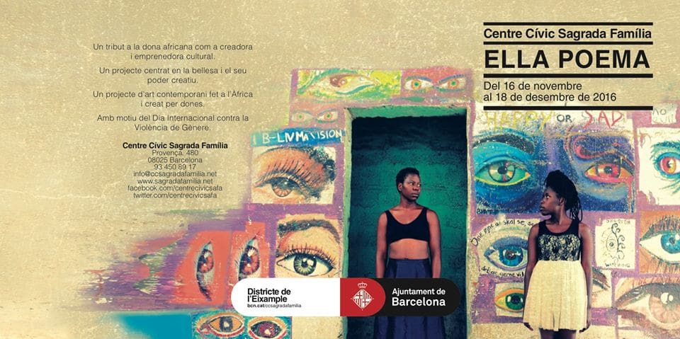 El Centro Cívico de Sagrada Familia de Barcelona organiza una serie de actividades muy completas para que podáis entender y acercaros al proyecto desde diferentes perspectivas. El 16 de noviembre se imparte una conferencia sobre el poder creativo de la belleza donde se hablará del proceso creativo de ELLA POEMA y se presentarán los cortometrajes realizados durante el proyecto. El 19 y 20 de noviembre se espera que el público barcelonés participe bailando en el curso intensivo de danza en el Institut del Teatre, III Ciclo de danza africana contemporánea (para inscripciones lanlamove@gmail.com). El 22 noviembre a las 20h se realizará la inauguración en el Centro Cívico de Sagrada Familia de la exposición de fotografías que estarán en el centro cívico hasta el 18 de diciembre.