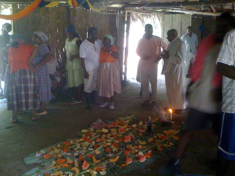 En segundo término, hay que hablar de su carácter sincrético. Seguramente lo que aparentemente nos resulta más tangible es el hecho de que todo Garífuna hable su propia lengua (mezcla entre arawak, francés, yoruba, swahili y bantú), además del español. Pero hay una esfera primordial en su cultura, la religiosidad, que merece un trato especial. A pesar de la resistencia a la evangelización y al hecho de que nunca abandonaran sus antiguas creencias, la combinación de distintos credos muestra la plasticidad de una cultura que aglutina rasgos de universos muy dispares. Su religión es un sincretismo entre el cristianismo y lo que se ha llamado ‘la religión de los ancestros’, a medio camino entro lo africano y lo amerindio. Prueba de ello son el Yurumein, una celebración que recoge trazos de religión cristiana, rituales Arawak y que incide especialmente en la descendencia africana del colectivo; o el ritual del Reenactment, una tradición en forma de festividad alrededor de la gastronomía (con el elemento más importante en la cocina Garífuna, el casabe o ‘pan de yuca’, como eje central), la música (con la presencia esencial de la ruguma, su instrumento más famoso) y la danza, dónde se invoca la historia y se legitima su identidad étnica. La herencia y la tradición tienen un peso crucial para el grupo. Por ello los rituales del Chugu y el Dugu se consideran igualmente claves para la veneración y el culto a los ancestros (aharis).